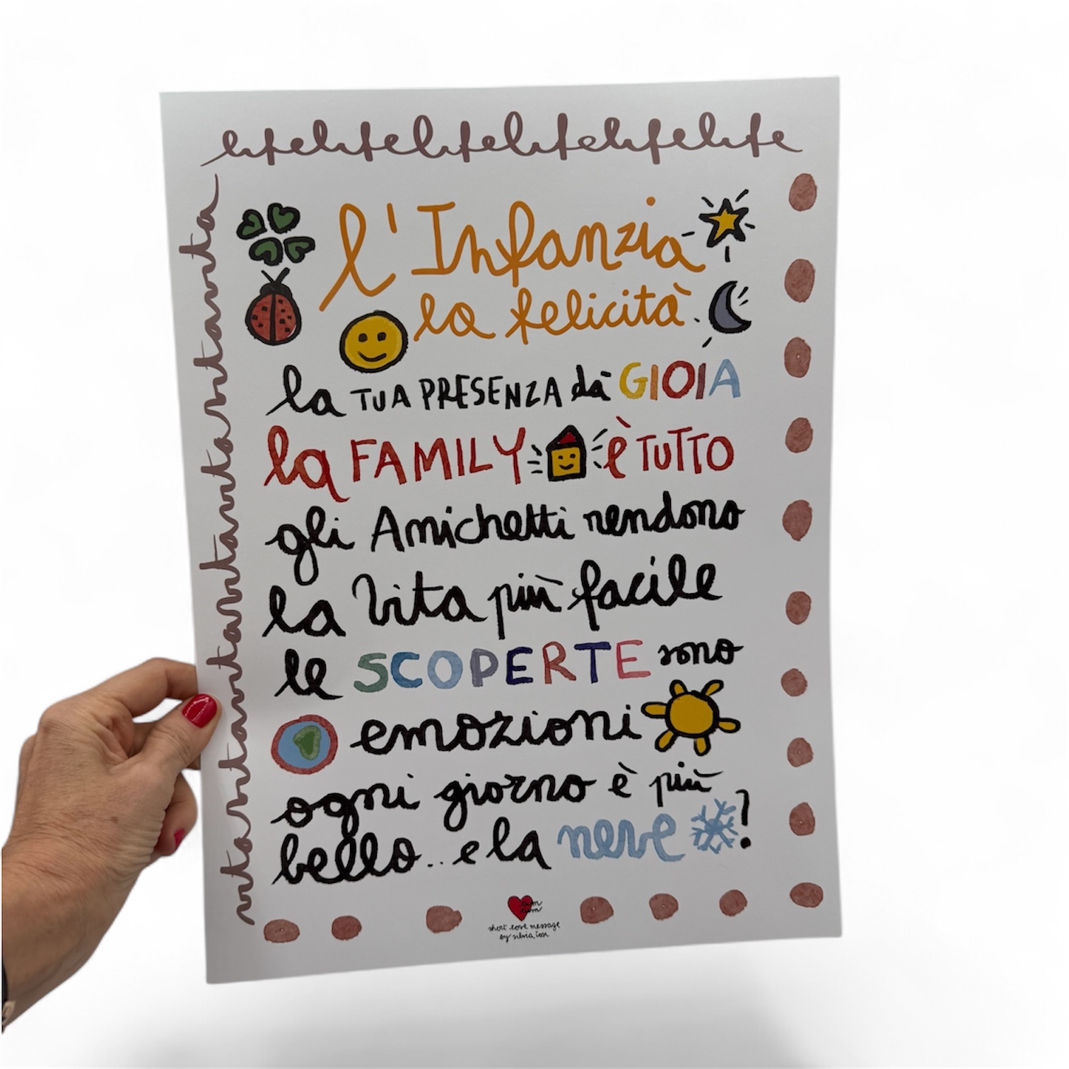 € 30,00 IVA inclusaLa stampa su cartoncino Infanzia è un’opera in acquerello di Silvia Tosi per Short Love Message che racconta in una serie di messaggi cos’è l’infanzia. un regalo bellissimo da fare ad un bambino, da mettere nella sua stanza. è possibile personalizzarlo con il nome scritto a mano. lo accompagnerà nella…