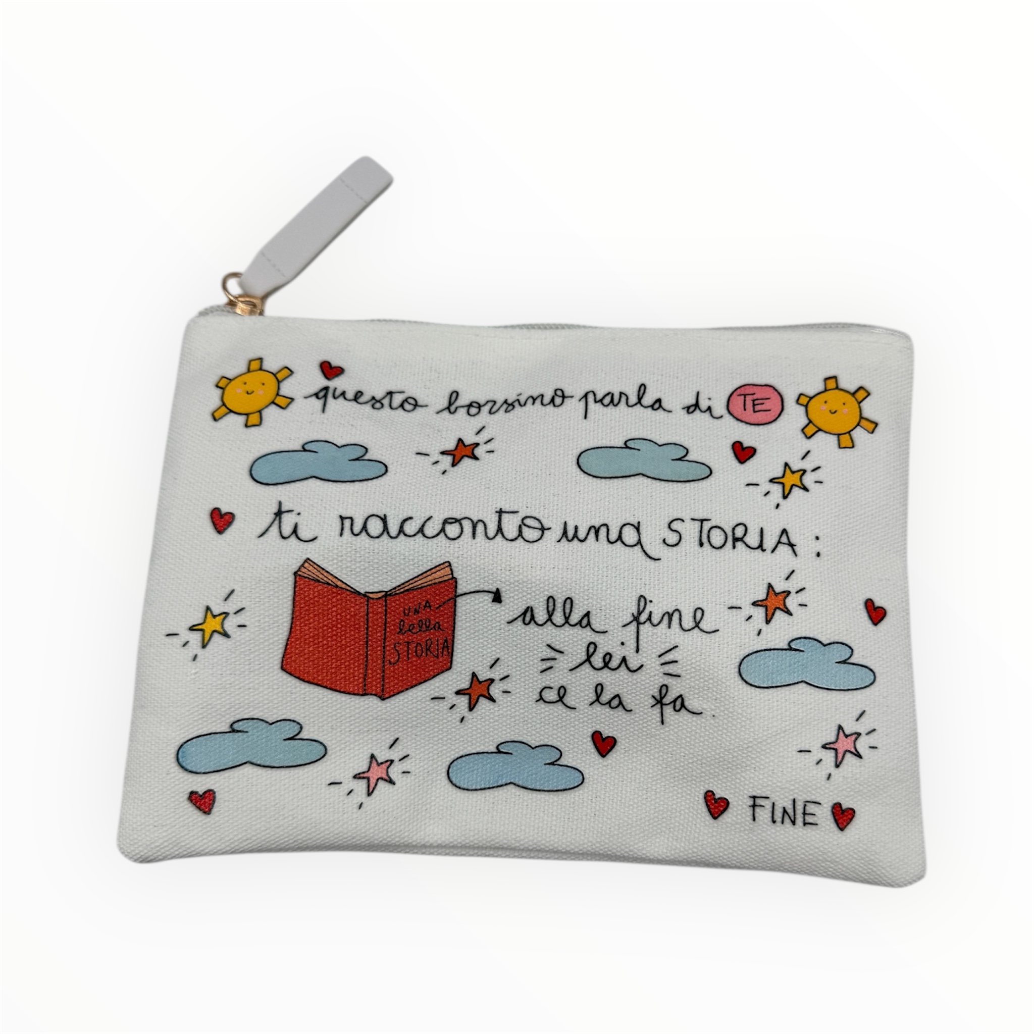 € 30,00 IVA inclusailo borsino ti racconta una storia in cui lei ce la fa. Fine. E’ una bella storia, beneaugurante ,motivazionale e sfidante, tutta racchiusa in un borsino in Canvas disegnato e pensato sa Silvia Tosi per short love message e stampato egregiamente. E’ possibile avere la personalizzazione del nome sul retro…