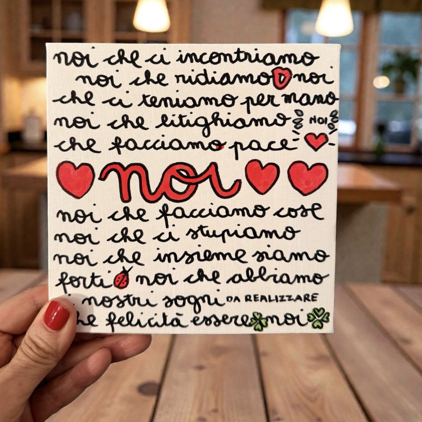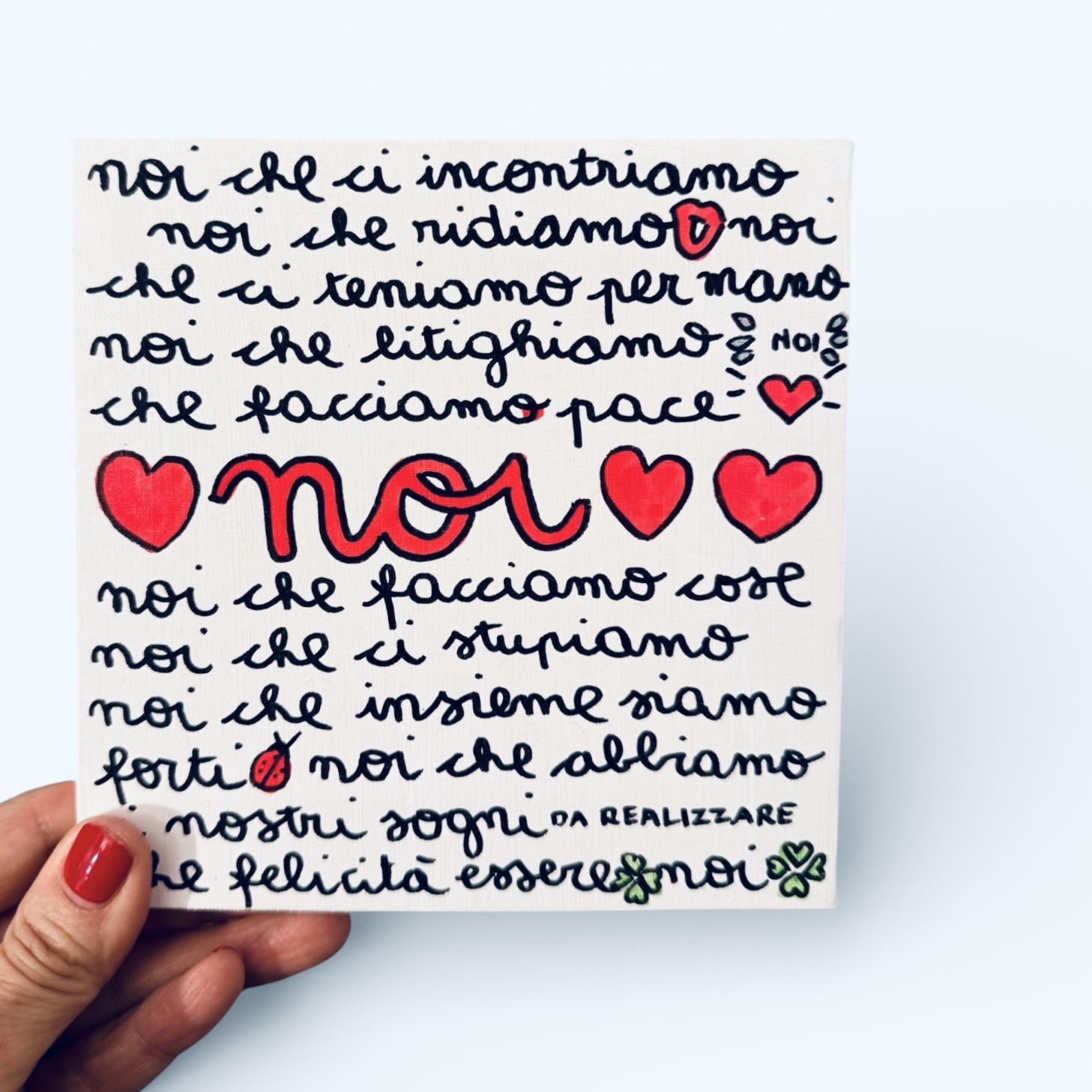 Noi é un racconto fatto di sguardi, di momento e di sensazioni. E’ un quadro che misura cm.15×15 realizzato a mano e pensato da Silvia Tosi che cristallizza su tela le emozioni dell’essere noi. É personalizzabile duo lati con i nomi dei protagonisti ed é subito un’emozione da appendere al…