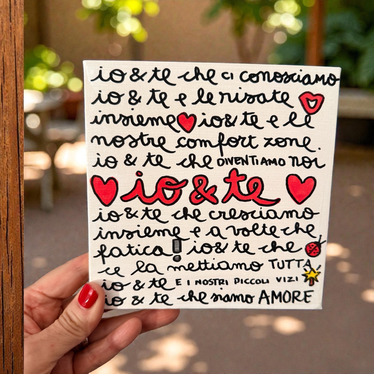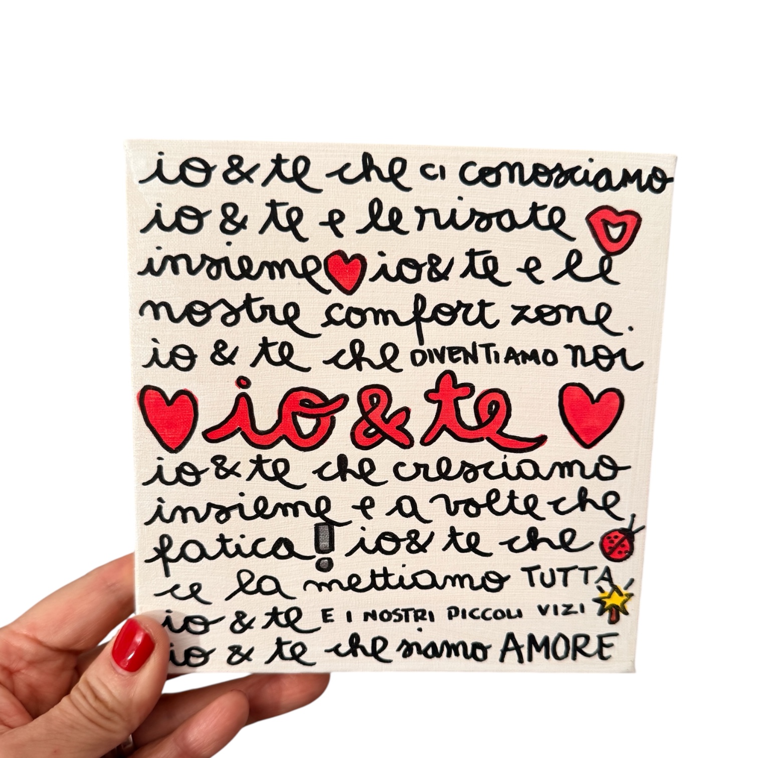Io & te è un quadretto che misura cm.15×15 in cui Silvia ci porta per mano e ci racconta piccole emozioni che viviamo col nostro partner.