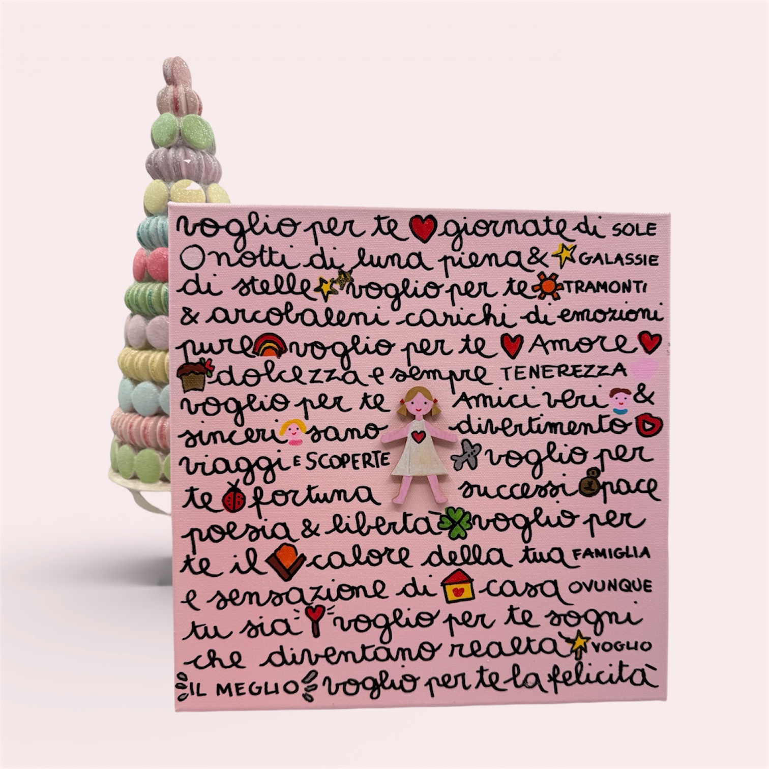 Voglio per te rosa 30×30 dedicato ad una bambina appena nata è un quadro che allieterà mamme e bambini e che renderà la cameretta della nuova arrivata sicuramente più felice. E’ possibile chiedere a Silvia di inserire il nome e farlo personalizzato perchè ogni quadro viene realizzato a mano dall’artista.